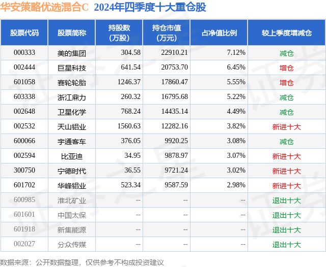 从基金规模来看,华安策略优选混合C基金2024年四季度公布的基金规模为0.03亿元,较上一期规模298.81万元变化了-41.19万元,环比变化了-13.78%。该基金最新一期资产配置为:股票占净值比72.51%,债券占净值比0.64%,现金占净值比24.78%。从基金持仓来看,该基金当季前十大股票仓位达44.8%,第一大重仓股为美的集团(000333),持仓占比为7.12%。