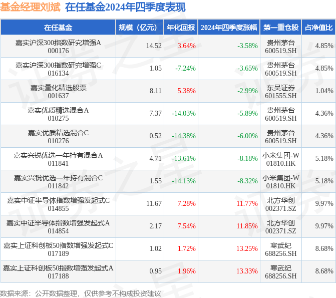 嘉实兴锐优选一年持有混合C现任基金经理为刘斌,本季度增聘基金经理刘斌,近期离任的基金经理为洪流。其中在任基金经理刘斌已从业14年又236天,2024年12月14日正式接手管理嘉实兴锐优选一年持有混合C,任职期间累计回报为-0.78%。目前还管理着11只基金产品(包括A类和C类),其中本季度表现最佳的基金为嘉实上证科创板50指数增强发起式A(017188),季度净值涨幅为13.33%。