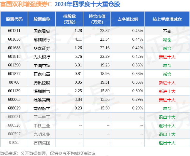 从基金规模来看,富国双利增强债券C基金2024年四季度公布的基金规模为0.3亿元,较上一期规模1109.33万元变化了1919.79万元,环比变化了173.06%。该基金最新一期资产配置为:股票占净值比11.81%,债券占净值比87.17%,现金占净值比1.41%。从基金持仓来看,该基金当季前十大股票仓位达3.69%,第一大重仓股为国泰君安(601211),持仓占比为0.45%。