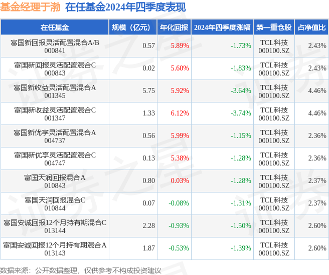 从基金规模来看,富国安诚回报12个月持有期混合A基金2024年四季度公布的基金规模为1.87亿元,较上一期规模2.09亿元变化了-2167.56万元,环比变化了-10.37%。该基金最新一期资产配置为:股票占净值比30.13%,债券占净值比61.95%,现金占净值比8.3%。从基金持仓来看,该基金当季前十大股票仓位达14.54%,第一大重仓股为TCL科技(000100),持仓占比为2.6%。