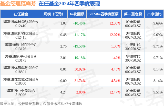 证券之星消息,日前海富通成长领航混合A基金公布四季报,2024年四季度最新规模1.07亿元,季度净值涨幅为12.3%。