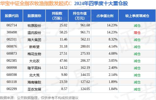 从基金规模来看,华宝中证全指农牧渔指数发起式C基金2024年四季度公布的基金规模为0.43亿元,较上一期规模5864.49万元变化了-1600.47万元,环比变化了-27.29%。该基金最新一期资产配置为:股票占净值比94.33%,无债券类资产,现金占净值比8.63%。从基金持仓来看,该基金当季前十大股票仓位达56.32%,第一大重仓股为牧原股份(002714),持仓占比为14.23%。