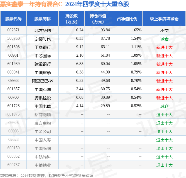 从基金规模来看,嘉实鑫泰一年持有混合C基金2024年四季度公布的基金规模为0.15亿元,较上一期规模2819.3万元变化了-1283.8万元,环比变化了-45.54%。该基金最新一期资产配置为:股票占净值比14.11%,债券占净值比77.52%,现金占净值比9.71%。从基金持仓来看,该基金当季前十大股票仓位达9.53%,第一大重仓股为北方华创(002371),持仓占比为1.65%。
