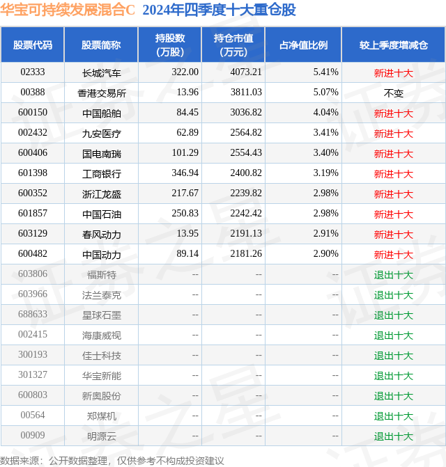 从基金规模来看,华宝可持续发展混合C基金2024年四季度公布的基金规模为2.37亿元,较上一期规模2.55亿元变化了-1855.78万元,环比变化了-7.27%。该基金最新一期资产配置为:股票占净值比80.51%,无债券类资产,现金占净值比17.71%。从基金持仓来看,该基金当季前十大股票仓位达36.29%,第一大重仓股为长城汽车(02333),持仓占比为5.41%。