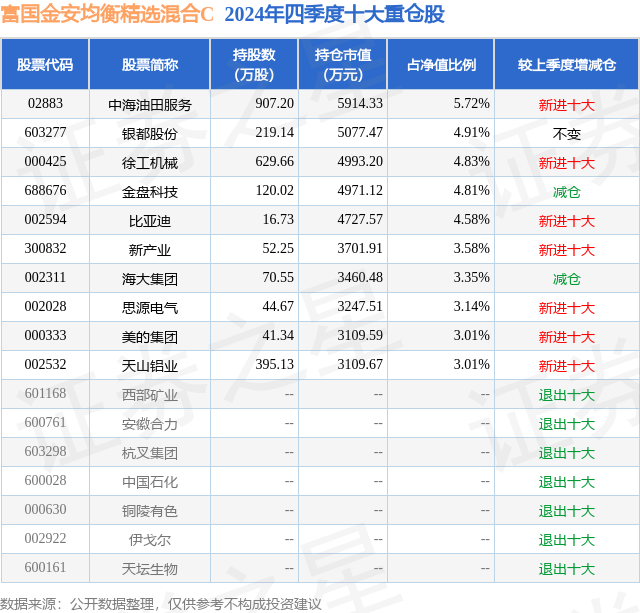 从基金规模来看,富国金安均衡精选混合C基金2024年四季度公布的基金规模为0.73亿元,较上一期规模8895.26万元变化了-1561.37万元,环比变化了-17.55%。该基金最新一期资产配置为:股票占净值比84.9%,债券占净值比2.88%,现金占净值比13.04%。从基金持仓来看,该基金当季前十大股票仓位达40.94%,第一大重仓股为中海油田服务(02883),持仓占比为5.72%。