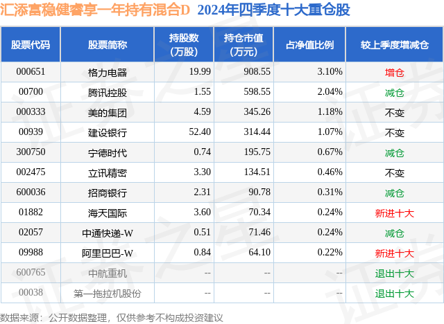 证券之星消息,日前汇添富稳健睿享一年持有混合D基金公布四季报,2024年四季度最新规模2.9亿元,季度净值涨幅为2.02%。