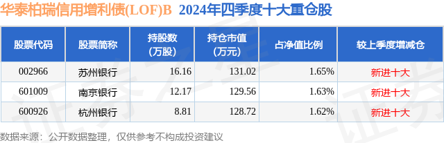 从基金规模来看,华泰柏瑞信用增利债(LOF)B基金2024年四季度公布的基金规模为0.44亿元,较上一期规模1.71亿元变化了-1.27亿元,环比变化了-74.11%。该基金最新一期资产配置为:股票占净值比4.91%,债券占净值比101.68%,现金占净值比4.48%。从基金持仓来看,该基金当季前十大股票仓位达4.9%,第一大重仓股为苏州银行(002966),持仓占比为1.65%。