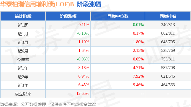 从业绩表现来看,华泰柏瑞信用增利债(LOF)B基金过去一年净值涨幅为3.18%,在同类基金中排名587/708,同类基金过去一年净值涨幅中位数为4.71%。而基金过去一年的最大回撤为-1.37%,成立以来的最大回撤为-6.96%。