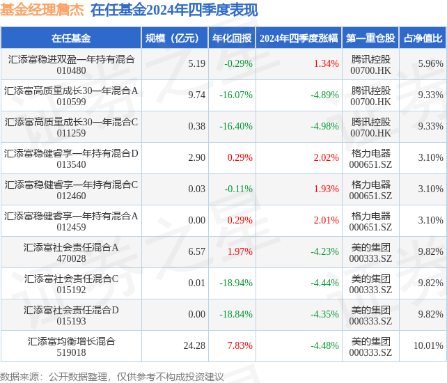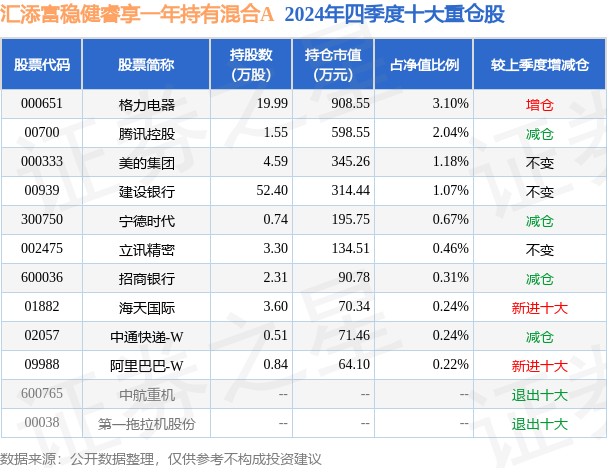 证券之星消息,日前汇添富稳健睿享一年持有混合A基金公布四季报,2024年四季度最新规模0.0亿元,季度净值涨幅为2.01%。