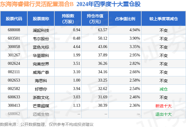 从基金规模来看,东海海睿健行灵活配置混合B基金2024年四季度公布的基金规模为0.04亿元,较上一期规模347.74万元变化了6.19万元,环比变化了1.78%。该基金最新一期资产配置为:股票占净值比79.87%,无债券类资产,现金占净值比10.03%。从基金持仓来看,该基金当季前十大股票仓位达30.56%,第一大重仓股为澜起科技(688008),持仓占比为4.94%。