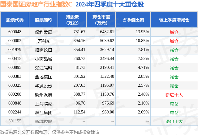从基金规模来看,国泰国证房地产行业指数C基金2024年四季度公布的基金规模为1.47亿元,较上一期规模2.02亿元变化了-5553.78万元,环比变化了-27.49%。该基金最新一期资产配置为:股票占净值比94.07%,无债券类资产,现金占净值比7.17%。从基金持仓来看,该基金当季前十大股票仓位达56.93%,第一大重仓股为保利发展(600048),持仓占比为13.95%。