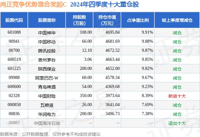 从基金规模来看,尚正竞争优势混合发起C基金2024年四季度公布的基金规模为2.27亿元,较上一期规模8.11亿元变化了-5.85亿元,环比变化了-72.06%。该基金最新一期资产配置为:股票占净值比94.77%,无债券类资产,现金占净值比8.78%。从基金持仓来看,该基金当季前十大股票仓位达91.69%,第一大重仓股为中国神华(601088),持仓占比为9.91%。