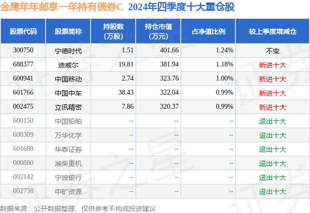 证券之星消息,日前金鹰年年邮享一年持有债券C基金公布四季报,2024年四季度最新规模0.05亿元,季度净值涨幅为0.7%。
