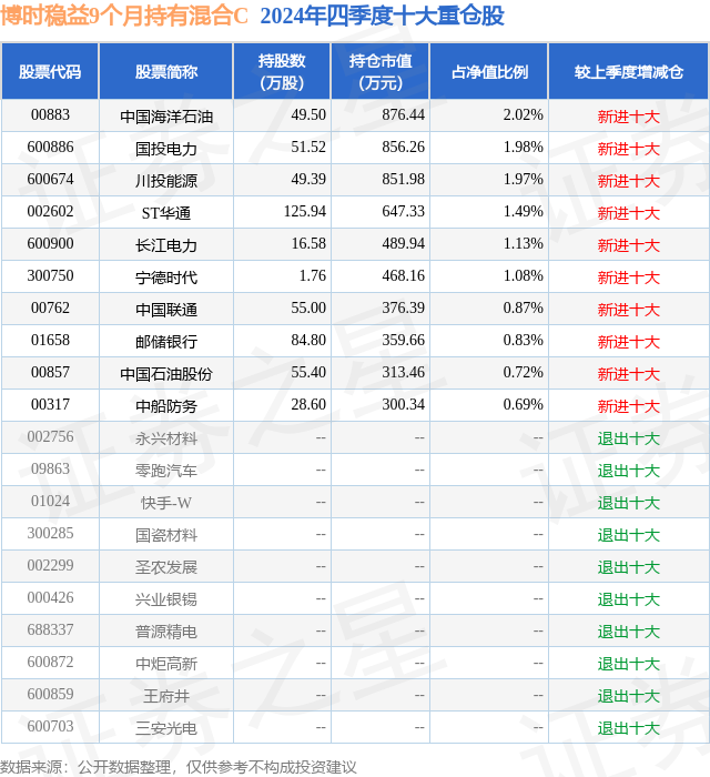 从基金规模来看,博时稳益9个月持有混合C基金2024年四季度公布的基金规模为1.99亿元,较上一期规模2.31亿元变化了-3178.38万元,环比变化了-13.76%。该基金最新一期资产配置为:股票占净值比18.72%,债券占净值比76.97%,现金占净值比10.63%。从基金持仓来看,该基金当季前十大股票仓位达12.78%,第一大重仓股为中国海洋石油(00883),持仓占比为2.02%。