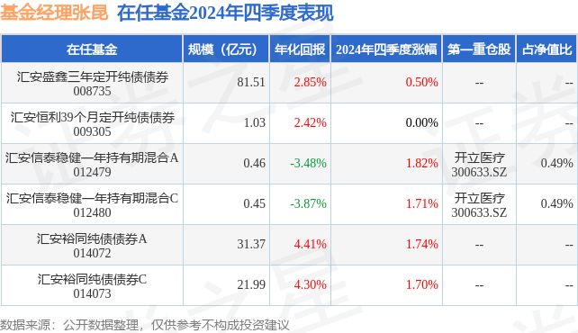 汇安信泰稳健一年持有期混合A现任基金经理为张昆。其中在任基金经理张昆已从业4年又123天,2024年3月26日正式接手管理汇安信泰稳健一年持有期混合A,任职期间累计回报为4.15%。目前还管理着6只基金产品(包括A类和C类),其中本季度表现最佳的基金为汇安信泰稳健一年持有期混合A(012479),季度净值涨幅为1.82%。
