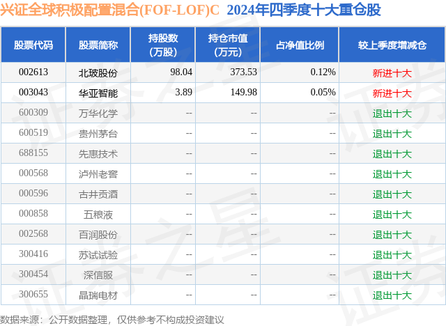 从基金规模来看,兴证全球积极配置混合(FOF-LOF)C基金2024年四季度公布的基金规模为1.44亿元,较上一期规模1.79亿元变化了-3509.78万元,环比变化了-19.57%。该基金最新一期资产配置为:股票占净值比0.17%,债券占净值比5.14%,现金占净值比1.29%。从基金持仓来看,该基金当季前十大股票仓位达0.17%,第一大重仓股为北玻股份(002613),持仓占比为0.12%。