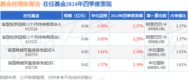 从基金规模来看,富国悦享回报12个月持有期混合C基金2024年四季度公布的基金规模为0.06亿元,较上一期规模858.03万元变化了-256.45万元,环比变化了-29.89%。该基金最新一期资产配置为:股票占净值比16.17%,债券占净值比52.24%,现金占净值比3.23%。从基金持仓来看,该基金当季前十大股票仓位达9.05%,第一大重仓股为阿里巴巴-W(09988),持仓占比为1.37%。