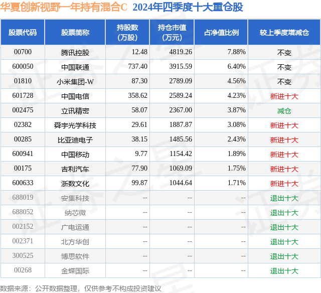 从基金规模来看,华夏创新视野一年持有混合C基金2024年四季度公布的基金规模为2.86亿元,较上一期规模2.98亿元变化了-1256.55万元,环比变化了-4.21%。该基金最新一期资产配置为:股票占净值比60.52%,无债券类资产,现金占净值比42.01%。从基金持仓来看,该基金当季前十大股票仓位达37.8%,第一大重仓股为腾讯控股(00700),持仓占比为7.88%。