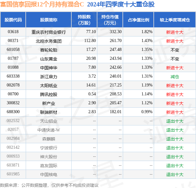 从基金规模来看,富国信享回报12个月持有混合C基金2024年四季度公布的基金规模为0.37亿元,较上一期规模4451.69万元变化了-704.5万元,环比变化了-15.83%。该基金最新一期资产配置为:股票占净值比31.72%,债券占净值比68.65%,现金占净值比0.86%。从基金持仓来看,该基金当季前十大股票仓位达13.01%,第一大重仓股为重庆农村商业银行(03618),持仓占比为1.82%。