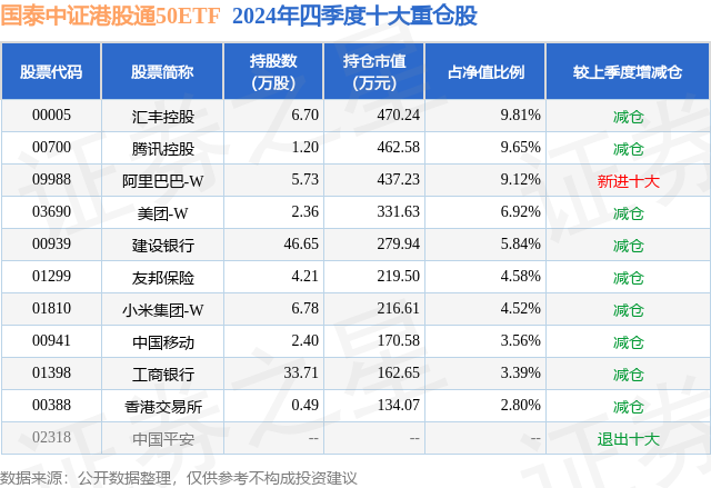 证券之星消息,日前国泰中证港股通50ETF基金公布四季报,2024年四季度最新规模0.48亿元,季度净值涨幅为0.02%。