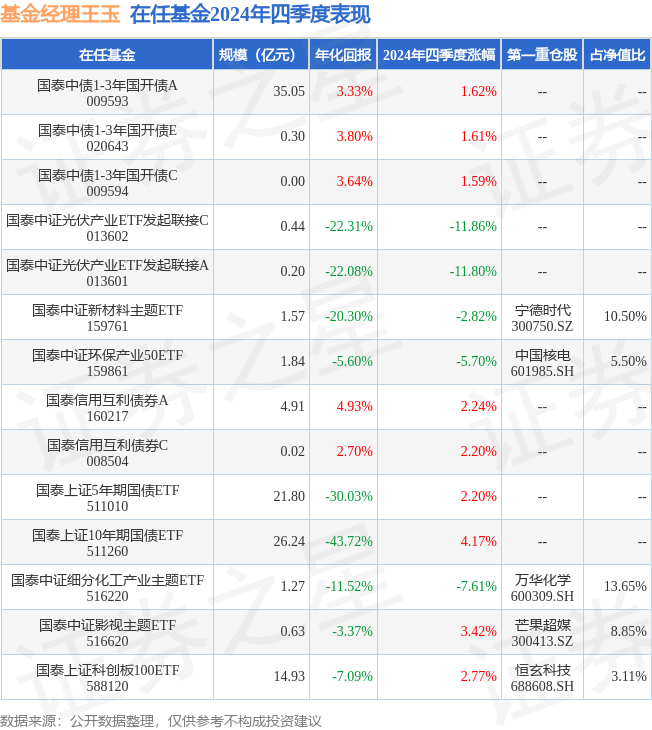 国泰中证新材料主题ETF现任基金经理为王玉。其中在任基金经理王玉已从业5年又31天,2021年11月24日正式接手管理国泰中证新材料主题ETF,任职期间累计回报为-51.08%。目前还管理着14只基金产品(包括A类和C类),其中本季度表现最佳的基金为国泰上证10年期国债ETF(511260),季度净值涨幅为4.17%。