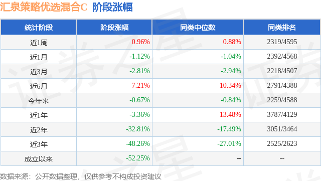 从业绩表现来看,汇泉策略优选混合C基金过去一年净值涨幅为-3.36%,在同类基金中排名3787/4129,同类基金过去一年净值涨幅中位数为13.48%。而基金过去一年的最大回撤为-19.07%,成立以来的最大回撤为-60.17%。