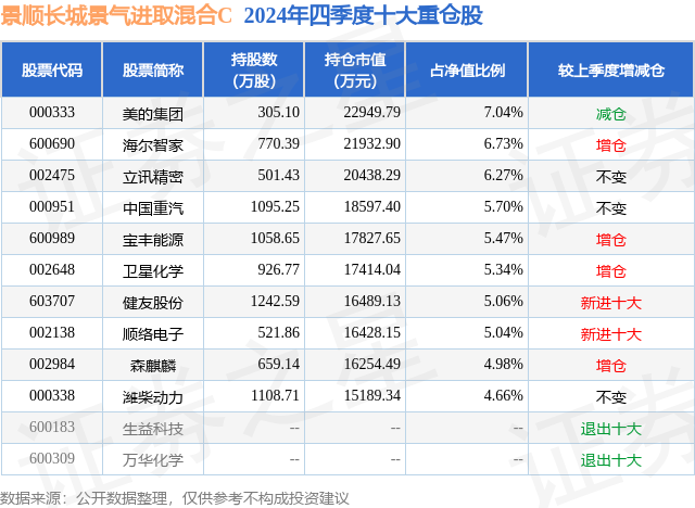 从基金规模来看,景顺长城景气进取混合C基金2024年四季度公布的基金规模为5.41亿元,较上一期规模6.05亿元变化了-6418.0万元,环比变化了-10.61%。该基金最新一期资产配置为:股票占净值比89.28%,债券占净值比5.0%,现金占净值比6.21%。从基金持仓来看,该基金当季前十大股票仓位达56.29%,第一大重仓股为美的集团(000333),持仓占比为7.04%。
