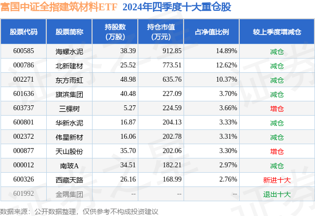 从基金规模来看,富国中证全指建筑材料ETF基金2024年四季度公布的基金规模为0.61亿元,较上一期规模6844.03万元变化了-712.58万元,环比变化了-10.41%。该基金最新一期资产配置为:股票占净值比99.59%,无债券类资产,现金占净值比0.83%。从基金持仓来看,该基金当季前十大股票仓位达60.91%,第一大重仓股为海螺水泥(600585),持仓占比为14.89%。