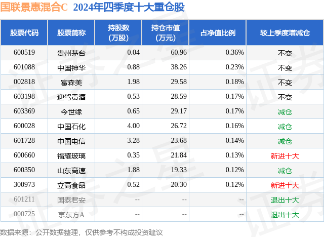 证券之星消息,日前国联景惠混合C基金公布四季报,2024年四季度最新规模0.61亿元,季度净值涨幅为2.05%。