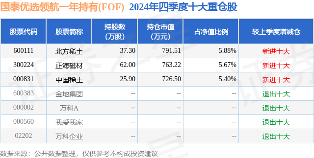 从基金规模来看,国泰优选领航一年持有(FOF)基金2024年四季度公布的基金规模为1.35亿元,较上一期规模1.6亿元变化了-2566.23万元,环比变化了-16.02%。该基金最新一期资产配置为:股票占净值比16.95%,债券占净值比5.64%,现金占净值比0.88%。从基金持仓来看,该基金当季前十大股票仓位达16.95%,第一大重仓股为北方稀土(600111),持仓占比为5.88%。