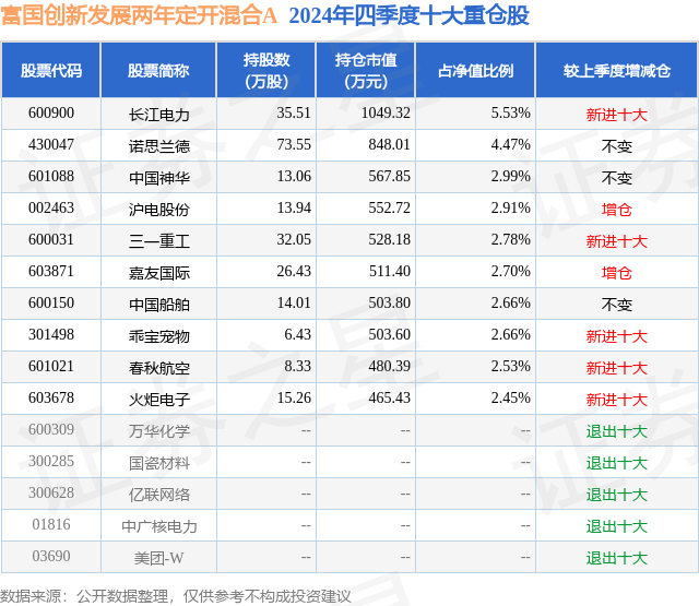 从基金规模来看,富国创新发展两年定开混合A基金2024年四季度公布的基金规模为1.67亿元,较上一期规模1.66亿元变化了113.1万元,环比变化了0.68%。该基金最新一期资产配置为:股票占净值比87.22%,无债券类资产,现金占净值比11.56%。从基金持仓来看,该基金当季前十大股票仓位达31.68%,第一大重仓股为长江电力(600900),持仓占比为5.53%。