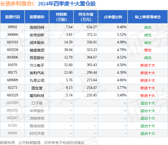 从基金规模来看,长信多利混合C基金2024年四季度公布的基金规模为0.0亿元,较上一期规模41.41万元变化了-10.64万元,环比变化了-25.69%。该基金最新一期资产配置为:股票占净值比91.33%,债券占净值比4.48%,现金占净值比6.16%。从基金持仓来看,该基金当季前十大股票仓位达49.42%,第一大重仓股为泡泡玛特(09992),持仓占比为9.4%。