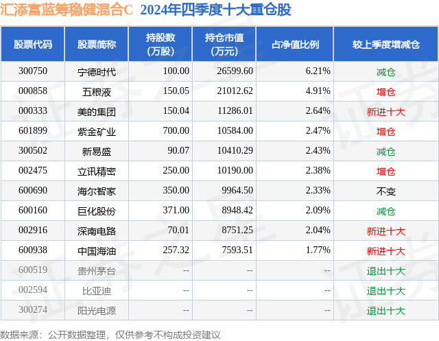 从基金规模来看,汇添富蓝筹稳健混合C基金2024年四季度公布的基金规模为0.0亿元,较上一期规模23.31万元变化了-2.34万元,环比变化了-10.04%。该基金最新一期资产配置为:股票占净值比70.17%,债券占净值比4.7%,现金占净值比25.59%。从基金持仓来看,该基金当季前十大股票仓位达29.27%,第一大重仓股为宁德时代(300750),持仓占比为6.21%。