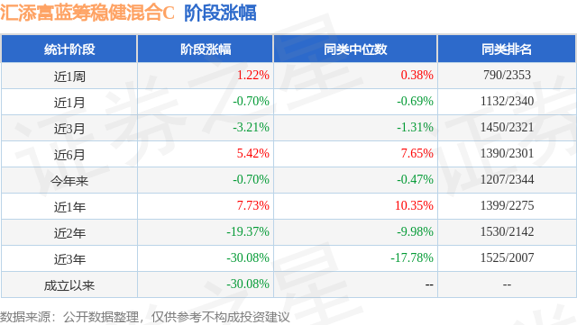 从业绩表现来看,汇添富蓝筹稳健混合C基金过去一年净值涨幅为7.73%,在同类基金中排名1399/2275,同类基金过去一年净值涨幅中位数为10.35%。而基金过去一年的最大回撤为-14.6%,成立以来的最大回撤为-38.06%。