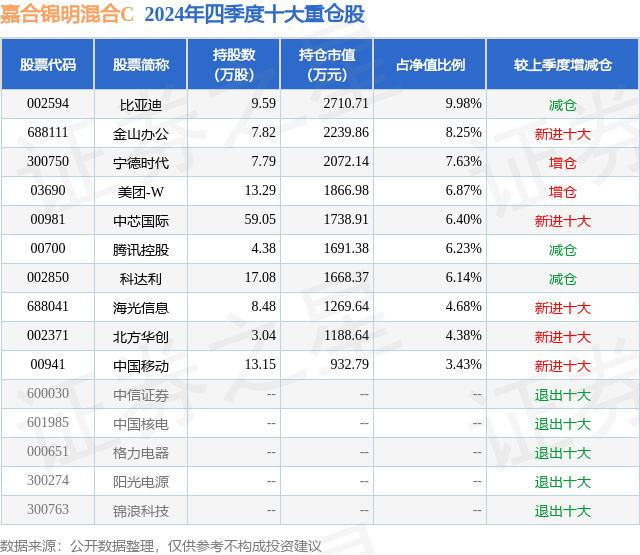 证券之星消息,日前嘉合锦明混合C基金公布四季报,2024年四季度最新规模1.53亿元,季度净值涨幅为-8.01%。