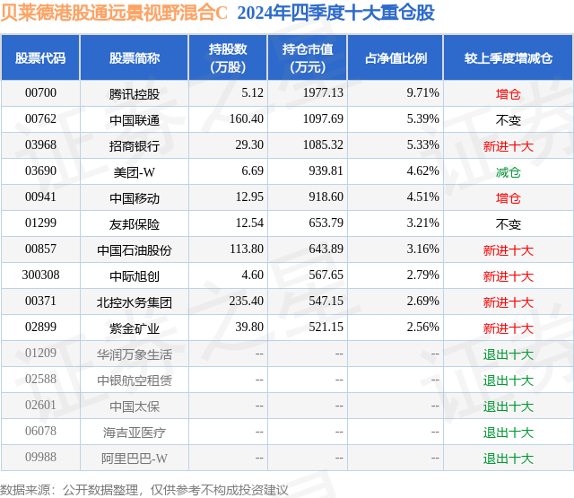 证券之星消息,日前贝莱德港股通远景视野混合C基金公布四季报,2024年四季度最新规模0.81亿元,季度净值涨幅为-6.05%。