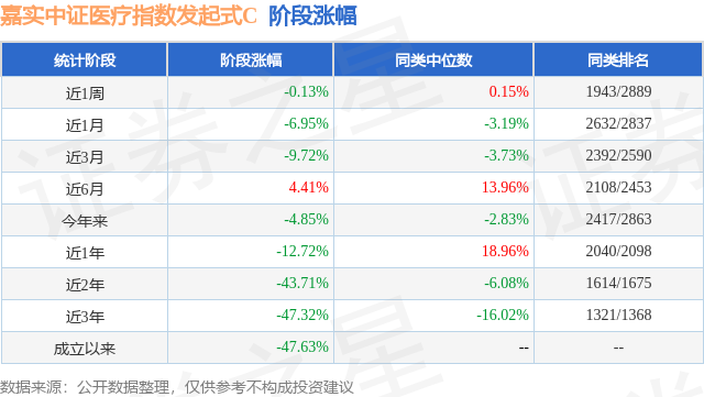 从业绩表现来看,嘉实中证医疗指数发起式C基金过去一年净值涨幅为-12.72%,在同类基金中排名2040/2098,同类基金过去一年净值涨幅中位数为18.96%。而基金过去一年的最大回撤为-25.15%,成立以来的最大回撤为-54.16%。