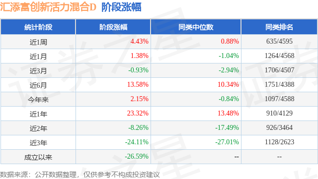 从业绩表现来看,汇添富创新活力混合D基金过去一年净值涨幅为23.32%,在同类基金中排名910/4129,同类基金过去一年净值涨幅中位数为13.48%。而基金过去一年的最大回撤为-14.44%,成立以来的最大回撤为-42.39%。