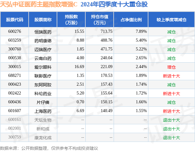 证券之星消息,日前天弘中证医药主题指数增强C基金公布四季报,2024年四季度最新规模0.49亿元,季度净值涨幅为-9.87%。