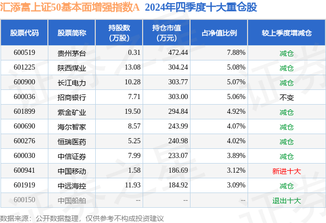 从基金规模来看,汇添富上证50基本面增强指数A基金2024年四季度公布的基金规模为0.36亿元,较上一期规模5055.86万元变化了-1465.85万元,环比变化了-28.99%。该基金最新一期资产配置为:股票占净值比91.5%,无债券类资产,现金占净值比8.87%。从基金持仓来看,该基金当季前十大股票仓位达46.2%,第一大重仓股为贵州茅台(600519),持仓占比为7.88%。