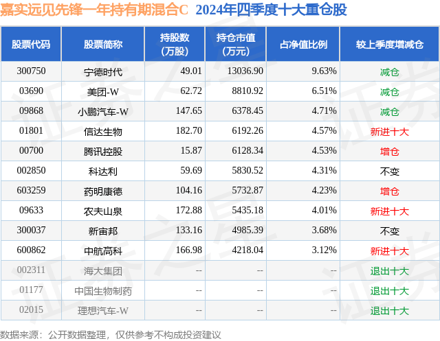 从基金规模来看,嘉实远见先锋一年持有期混合C基金2024年四季度公布的基金规模为0.87亿元,较上一期规模9175.45万元变化了-523.24万元,环比变化了-5.7%。该基金最新一期资产配置为:股票占净值比92.46%,债券占净值比0.05%,现金占净值比5.66%。从基金持仓来看,该基金当季前十大股票仓位达49.3%,第一大重仓股为宁德时代(300750),持仓占比为9.63%。