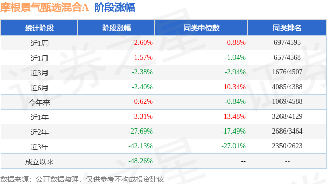 从业绩表现来看,摩根景气甄选混合A基金过去一年净值涨幅为3.31%,在同类基金中排名3268/4129,同类基金过去一年净值涨幅中位数为13.48%。而基金过去一年的最大回撤为-18.67%,成立以来的最大回撤为-53.23%。