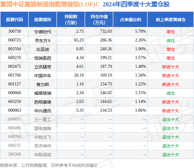 从基金规模来看,富国中证高端制造指数增强型(LOF)C基金2024年四季度公布的基金规模为0.16亿元,较上一期规模1382.06万元变化了208.09万元,环比变化了15.06%。该基金最新一期资产配置为:股票占净值比94.23%,无债券类资产,现金占净值比6.49%。从基金持仓来看,该基金当季前十大股票仓位达18.9%,第一大重仓股为宁德时代(300750),持仓占比为5.78%。
