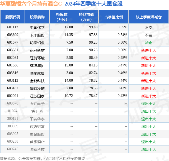 从基金规模来看,华夏稳福六个月持有混合C基金2024年四季度公布的基金规模为0.75亿元,较上一期规模8385.23万元变化了-865.83万元,环比变化了-10.33%。该基金最新一期资产配置为:股票占净值比13.32%,债券占净值比105.33%,现金占净值比7.66%。从基金持仓来看,该基金当季前十大股票仓位达4.8%,第一大重仓股为中国化学(601117),持仓占比为0.55%。