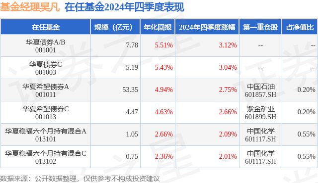 华夏稳福六个月持有混合C现任基金经理为吴凡,近期离任的基金经理为张海静。其中在任基金经理吴凡已从业2年又93天,2022年10月24日正式接手管理华夏稳福六个月持有混合C,任职期间累计回报为6.89%。目前还管理着6只基金产品(包括A类和C类),其中本季度表现最佳的基金为华夏债券A/B(001001),季度净值涨幅为3.12%。