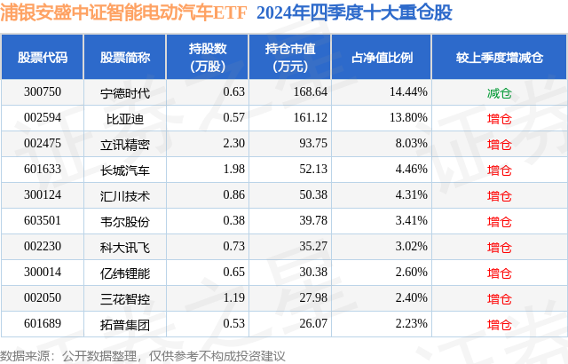 从基金规模来看,浦银安盛中证智能电动汽车ETF基金2024年四季度公布的基金规模为0.12亿元,较上一期规模1060.46万元变化了107.3万元,环比变化了10.12%。该基金最新一期资产配置为:股票占净值比94.69%,无债券类资产,现金占净值比5.25%。从基金持仓来看,该基金当季前十大股票仓位达58.7%,第一大重仓股为宁德时代(300750),持仓占比为14.44%。