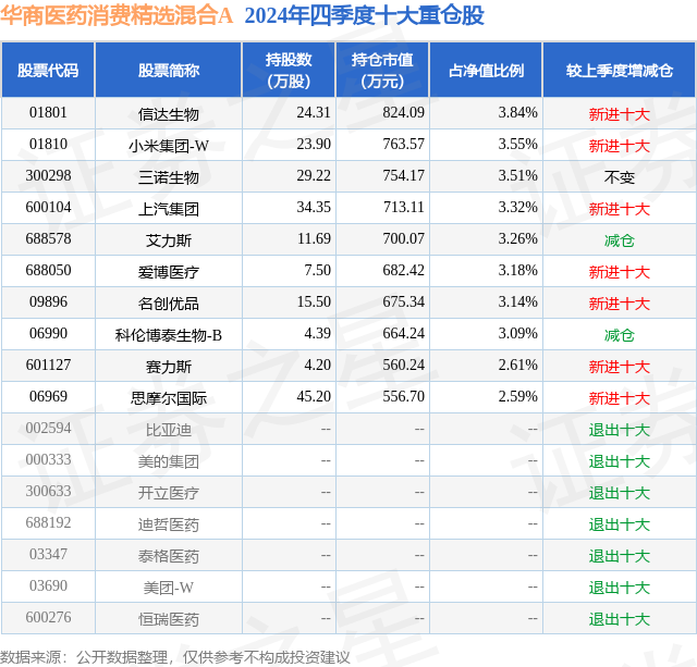 从基金规模来看,华商医药消费精选混合A基金2024年四季度公布的基金规模为2.01亿元,较上一期规模2.23亿元变化了-2233.08万元,环比变化了-10.02%。该基金最新一期资产配置为:股票占净值比82.89%,无债券类资产,现金占净值比17.33%。从基金持仓来看,该基金当季前十大股票仓位达32.09%,第一大重仓股为信达生物(01801),持仓占比为3.84%。