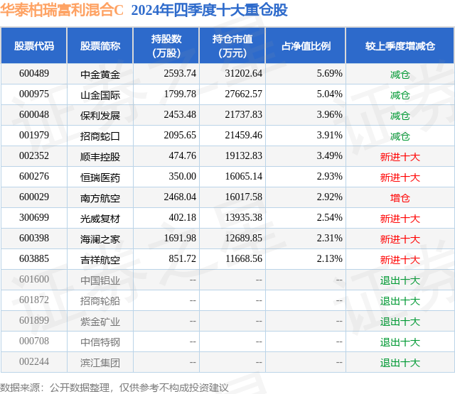 从基金规模来看,华泰柏瑞富利混合C基金2024年四季度公布的基金规模为13.17亿元,较上一期规模15.42亿元变化了-2.25亿元,环比变化了-14.56%。该基金最新一期资产配置为:股票占净值比92.46%,无债券类资产,现金占净值比11.07%。从基金持仓来看,该基金当季前十大股票仓位达34.92%,第一大重仓股为中金黄金(600489),持仓占比为5.69%。