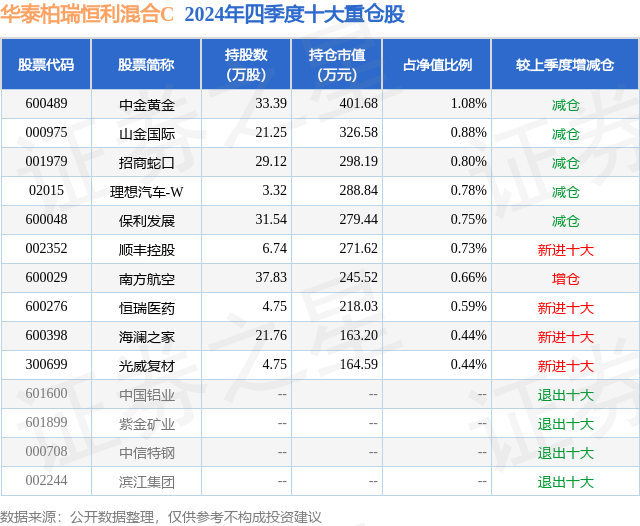从基金规模来看,华泰柏瑞恒利混合C基金2024年四季度公布的基金规模为0.64亿元,较上一期规模1.35亿元变化了-7169.03万元,环比变化了-52.97%。该基金最新一期资产配置为:股票占净值比18.36%,债券占净值比91.64%,现金占净值比1.53%。从基金持仓来看,该基金当季前十大股票仓位达7.15%,第一大重仓股为中金黄金(600489),持仓占比为1.08%。