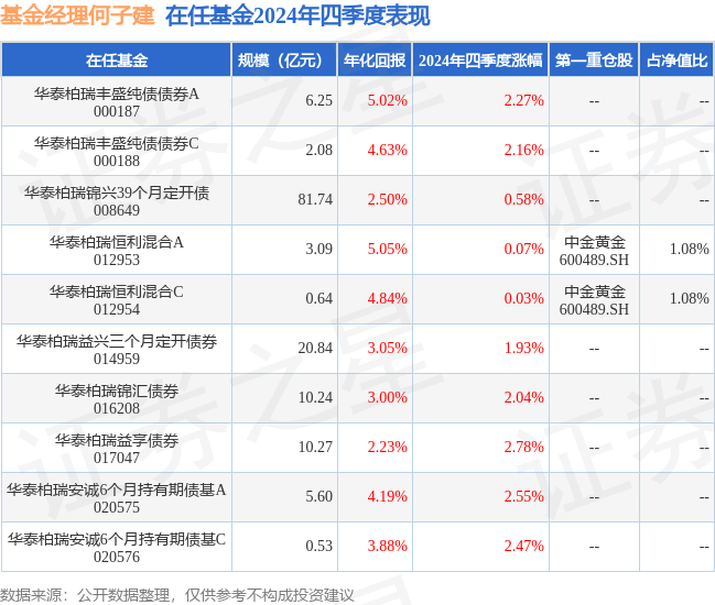 从基金规模来看,华泰柏瑞恒利混合A基金2024年四季度公布的基金规模为3.09亿元,较上一期规模3.29亿元变化了-2049.84万元,环比变化了-6.23%。该基金最新一期资产配置为:股票占净值比18.36%,债券占净值比91.64%,现金占净值比1.53%。从基金持仓来看,该基金当季前十大股票仓位达7.15%,第一大重仓股为中金黄金(600489),持仓占比为1.08%。